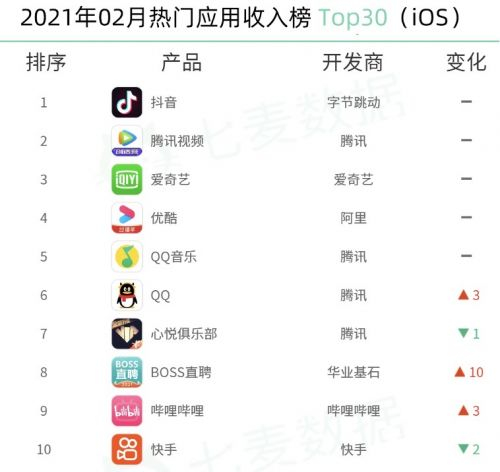 3月9日消息,近日,移动应用数据分析平台七麦数据发布2月热门应用排行榜,包含应用下载榜和应用收入榜。其中,抖音、腾讯视频、爱奇艺位列收入榜前三,BOSS直聘位居第8名,较上个月提升10个名次。