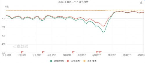 七麦数据显示,自“金三银四”招聘季开启后,BOSS直聘APP在苹果应用总榜、免费版、商务榜排名持续攀升。在商务榜上,BOSS直聘持续保持了第一、第二的排名。平台数据显示,BOSS直聘日均下载量超过85000次,超过行业平均水平。