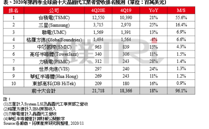 目前,全球代工市场格局比较稳定,基本由台积电、三星、格罗方德、联电和中芯国际“五大金刚”领衔。拓墣产业研究院发布的2020年第四季度全球前十大晶圆代工厂商营收和排名预测显示,台积电一家独大,市占率达55.6%;三星位居其次,市占率为16.9%;联电和格罗方德一直在互相追赶,第四季度联电逆袭至第三位,市占率达6.9%;格罗方德则营收收减,位居第四,市占率为6.6%;中芯国际,市占率为4.3%,排名第五。
