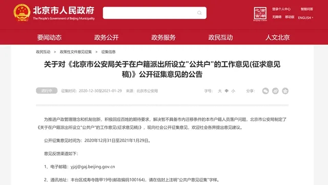 去年12月31日,北京市公安局发布了《关于在户籍派出所设立“公共户”的工作意见(征求意见稿)》(下称“征求意见稿”),该文件提出将在北京全局户籍派出所推动设立“公共户”,以解决暂不具备市内迁移条件的本市户籍人员落户问题。