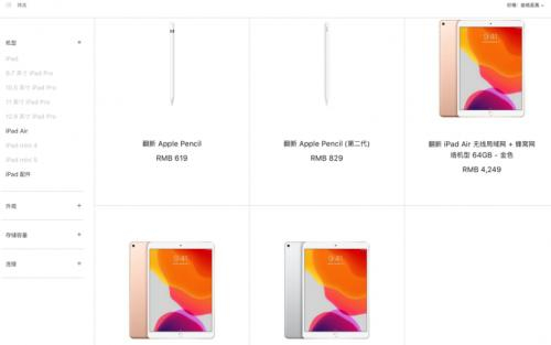至于翻新版iPad,覆盖的机型就更少了,目前苹果中国官网只有部分iPad Air机型。