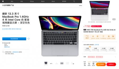 其次,苹果官网售卖的翻新机,仍处于中高端价位区间,并不算便宜。以翻新版Mac为例,Macbook Pro2020款的售价最低8199元,MacBook Air2019款的售价至少也要5288元。这两款机器相比全新机的售价虽略有下降,但仍处在中高端价位区间。