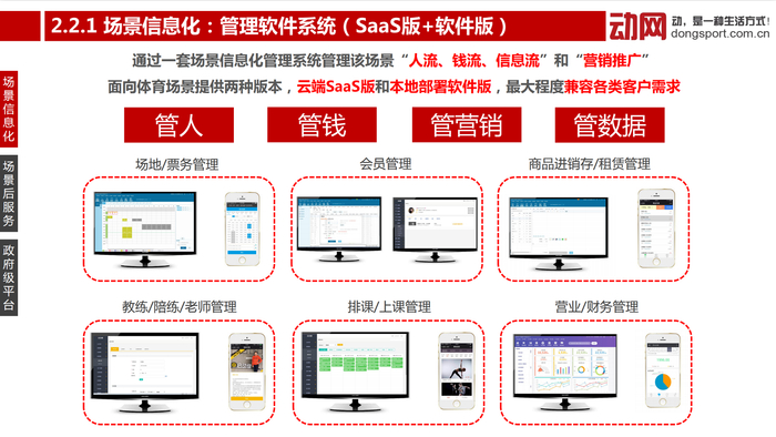 场馆信息化:动网为体育场馆提供自主知识产权的SaaS软件系统,帮助体育场馆提高管理效率,降低运营成本;并为体育场馆进行基于物联网技术的智慧化改造,大大提升运动用户的使用体验。动网目前已在28个城市服务了近3万家各种类型的体育场馆。