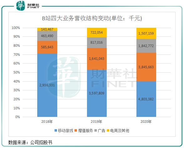 2020年四季度,B站增值业务收入首次超越移动游戏收入,成为B站第一大业务支柱,广告业务和电商及其他业务也相对发展迅速。