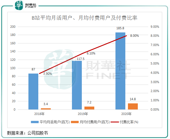 在2020年,B站的平均月活用户接近1.86亿人,2018年-2020年期间月活用户复合年增长率达46.14%;月均付费人数达1480万人,2018年-2020年复合年增长率为108.64%。同时,B站2020年付费比率达8%,较2018年提升4.1个百分点。2018年-2020年,B站每名活跃用户每天使用时间由75分钟以上提升至80分钟以上。而在2020年,全国移动应用平台每名活跃用户每天使用时间仅为29.8分钟。