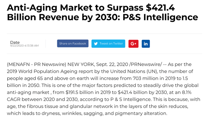 迅速老化的孱弱人口让我们经济大伤元气,另一种情况是,如果每个人都能拥有更有干劲、更长的晚年生活,将扭转局面,催生老年人口红利。如何探寻相关生科技术有望成为未来新的经济增长点。据市场研究机构P&S Intelligence资料,全球抗老市场将从2019年的1915亿美元,增至2030年的4214亿美元,后市可观。