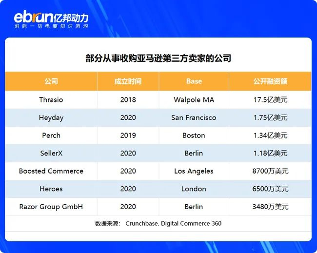 根据企业服务数据库公司Crunchbase的数据,仅2020年一年就有超过10亿美元的新资金,投入到了这些收购亚马逊第三方店铺的公司。这些公司主要分布在美国、德国、英国等地。
