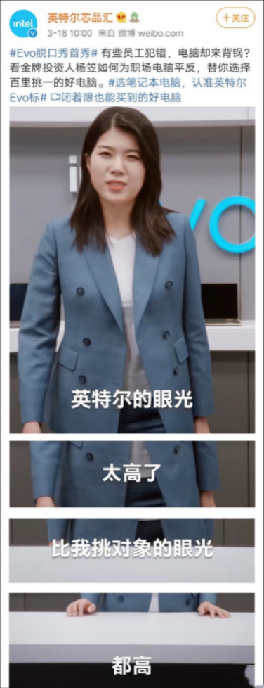 粗看之下,这就是一条普普通通的推广微博,文案中也透着硬广的“质朴”:“替你选择百里挑一的好电脑。”但视频中却暗藏玄机,“Intel眼光,太高了,比我挑对象的眼光,都高”,这几句话,普通人说出来或许激不起太大水花,但偏偏视频中出现的是,最近半年频频因两性话题上热搜的脱口秀演员杨笠。