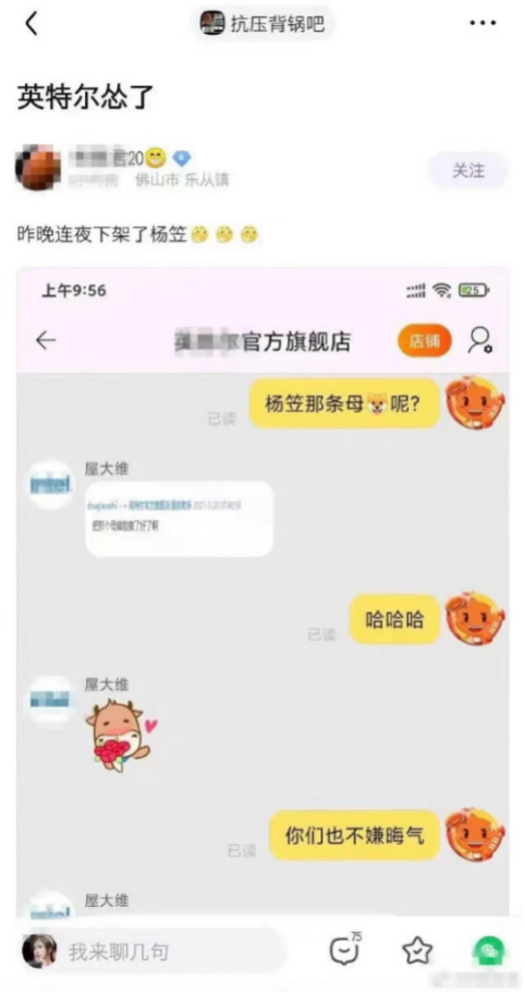 极少出现在微博热搜上的Intel,哪见过这种场面。Intel害怕了,不仅连夜删除了杨笠微博代言视频,连淘宝官方海报也一并删除了。甚至在网友私信Intel淘宝客服,用侮辱性言论询问:“杨笠那条母狗呢?”的时候,官方客服还同样以“母猪脸”这样的侮辱性的词汇回应。