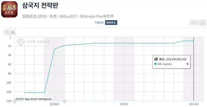 韩国市场:「三国志·战略版」是在 2 月 25 日开始在韩国市场大推,目前来看该游戏在 iOS 和 GooglePlay 都呈现了稳定上升的趋势且均已进入游戏畅销榜 TOP10。或有可能在 3 月份也拿下韩国市场月度收入榜 TOP10 中的一个席位。