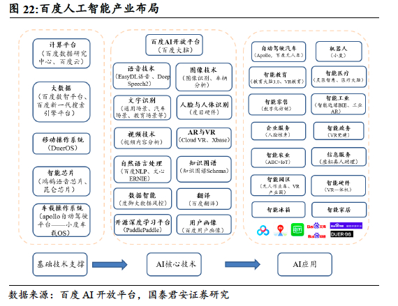 百度人工智能布局基于基础技术支撑,并掌握了核心技术,人工智能下游基本覆盖全领域。百度基础技术支撑包括计算平台、大数据、移动操作系统、车载操作系统和智能芯片,人工智能核心技术在AI生产平台百度大脑下开展,包括开源深度学习平台、自然语音处理、语音识别、知识图谱、图像识别、用户画像、生物特征识别、AR/VR、视频理解和翻译等。人工智能应用涵盖搜索、自动驾驶汽车、智能教育、视频、机器人、智能金融、网盘、智能客服、智能医疗、智能交通、知识管理、智能冰箱、智能家居和智能营销等。
