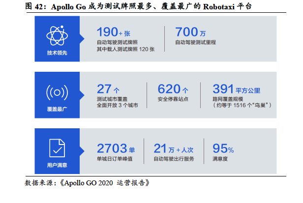 Apollo Go成为测试牌照最多、覆盖最广的Robotaxi平台,运营数据亮眼。根据《Apollo GO 2020 运营报告》,公司取得超过190张自动驾驶测试牌照,其中包括载人测试牌照120张。自动驾驶测试里程达到700万公里,测试城市覆盖27个,其中全面开放的城市为长沙、沧州、北京3个,安全停靠站点620个,路网覆盖规模超390平方公里。在用户运营方面,单城日订单峰值达2703单,自动驾驶出行服务21万+人次,运营数据表演优异,预计随着全面开放城市增加,Apollo Go护城河将不断夯实。