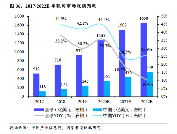预计2022年中国车联网市场规模超500亿美元,增速超25%。根据中国产业信息网,2019年全球车联网实际市场规模达932亿美元,其中中国市场为243亿美元,2018、2019年中国市场实际增速分别为44.9%和42.1%,连续两年超40%。预计2021年、2022年中国车联网市场规模将达到436和549亿美元,预计增速为25%左右,增速放缓但仍高于全球市场增速。