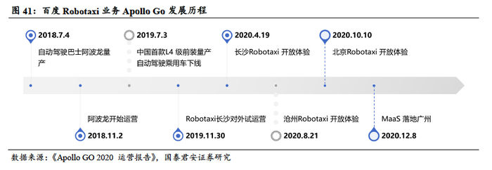 百度Robotaxi专车级服务+规模化覆盖+泛化能力+快速部署,三城商业化落地后规模运营可期。2018年,随着自动驾驶巴士阿波龙量产及开始运营,百度的自动驾驶业务解锁了封闭化园区道路;2019年3月,百度开发了中国首款L4级前装量产自动驾驶乘用车,随后Robotaxi在长沙正式对外试运营,标志着百度自动驾驶迈入城市开放道路运营的新阶段,也是自动驾驶业务商业化的重要一步。2020年,Robotaxi相继在长沙、沧州、北京正式运营。2020年12月,广州黄埔区与百度Apollo联手打造的全球首个服务多元出行的自动驾驶MaaS平台(Mobility as a Service)落地。