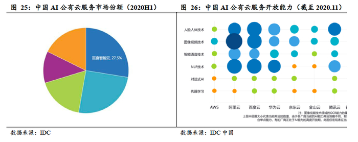 百度云在中国AI公有云服务市场连续3次排名第一,并在多领域市场份额保持第一。根据IDC报告,在中国AI公有云服务市场,百度智能云市场份额排名中国第一,2020H1市场份额达到27.5%这是百度智能云连续三次在AI Cloud市场排名第一。其中,百度智能云在人体识别、图像视频、NLP(自然语言处理)等领域市场份额第一,整体行业用户认知度最高。在对话式AI领域,百度智能云在API调用量第一,行业用户认知度最高。目前,百度智能云对外开放AI能力270多项,服务260多万开发者,日均调用量突破1万亿次。