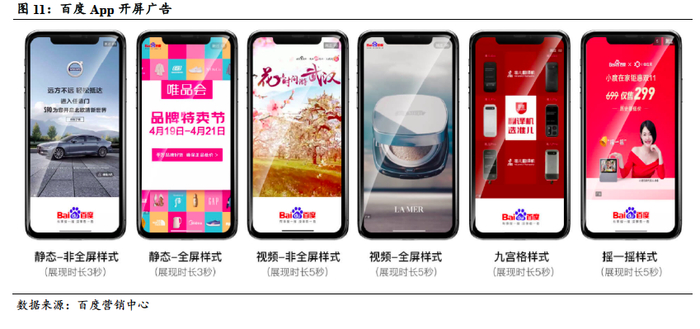 百度APP有多种广告投放方式,实现流量变现。1)开屏广告:多种样式开屏广告可供选择,通过用户行为线索数据实现精准定向投放。2)信息流广告:基于2亿日活用户,日均信息流推荐流量达到150亿+。3)搜索广告:每日搜索响应量60亿+。