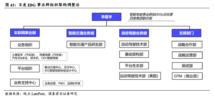 战略转向伴随IDG事业群组内部架构调整,进军整车领域蓄势待发。2021年1月11日,公司宣布,将以整车制造商的身份进军汽车行业,与浙江吉利控股集团有限公司组建一家智能电动汽车公司,吉利方面确认双方将基于吉利的纯电平台SEA浩瀚架构共同研发智能汽车。当天,百度副总裁、IDG总经理李震宇表示,IDG 内部将进行组织架构调整。根据晚点LatePost,2021年1月19日,百度IDG下设的车联网事业部进行架构调整,设立了小度助手(汽车版)、百度地图(汽车版)、汽车云&安全、轻车机和CDC(智能驾舱)5个业务组织、3个平台组织及3个业务支持中心。车联网事业部架构调整配合公司进军造车的整体战略,内部组织结构更加清晰,减少资源内耗。