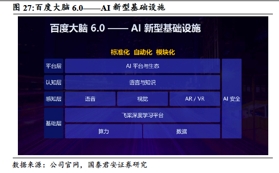 百度智能云增长进入快车道,“软硬一体AI大生产平台”的部署不断夯实。2020年第三季度,百度AI云收入为人民币22亿元,同比增长41%,第四季度,百度智能云增速大幅提升至67%,其年化收入约130亿元。百度智能云服务于to B(企业上云)、to C(个人云存储)和to G(如智能交通等)三个层面的目标用户,而差异化主要体现在由算法、算力、开放开源等构成的领先AI能力。百度大脑核心技术持续保持领先,随着6.0版本的推出,“软硬一体AI大生产平台”的部署不断夯实。百度大脑6.0已具备“知识增强的跨模态深度语义理解”能力,语音语言一体化理解、图像语言一体化理解,使得语音识别及图像识别准确率大幅提升,基于此,融合语音、语言的同声传译技术,翻译准确率超过80%,时延3秒。