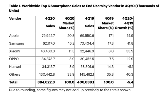 最近的数据,2020年第四季度,苹果智能手机销量力压三星,成为「全球最大智能手机厂商」,销量近8000万部。