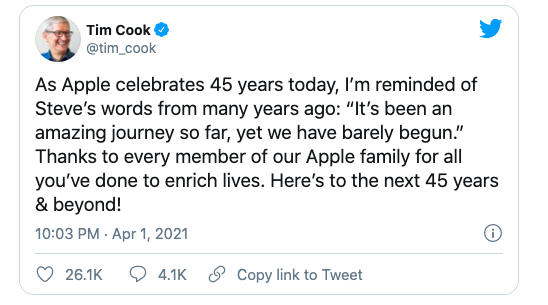 成立于1976年的苹果今年45岁了,如果将它比作人生的一个阶段,它正值壮年,苹果CEO库克发推:「这是一段了不起的旅程,但才刚刚开始」。
