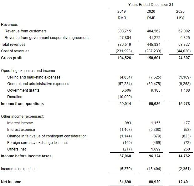 财报显示,该公司2020年Q4总营收为1.64亿元(人民币,下同),同比增长36.2%;净利润4700万元,同比增长94.6%。2020年总营收为4.46亿元,同比增长32.5%;净利润为8090万元,同比增长155.3%。
