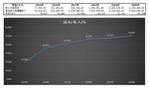 营收增长的背后,游戏开发商及UP主的分成成本也随之水涨船高。2015年,B站支付游戏开发商及UP主分成成本,仅占游戏收入及增值服务收入的19.42%,截至2020年末该成本占比已高达50.49%。