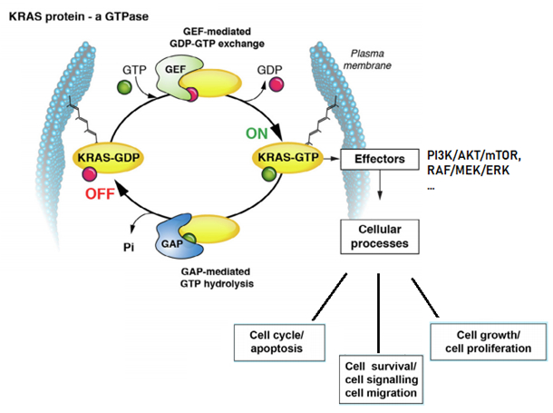 RAS是人类肿瘤中最先被鉴定出来的致癌基因,也是存在最为广泛的致癌性突变基因之一,发现至今已超过40年,一度被认为是“不可成药”靶点。RAS基因家族目前已知的成员包括KRAS、NRAS和HRAS,其中KRAS突变最为常见,大约占85%。RAS原癌基因编码细胞内鸟嘌呤核苷酸结合蛋白,属于GTPase家族。RAS GTPases通过响应细胞外信号,在结合GTP的激活状态(ON)与结合GDP的失活状态(OFF)之间循环转换,激活态KRAS调节多个下游信号级联,促进癌细胞增殖、存活和转移[1]。