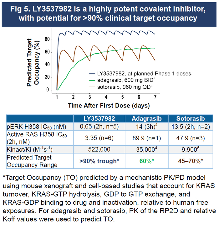 LY3537982作为一种高效的共价抑制剂,在KRAS G12C突变H358细胞中,抑制活性(IC50)较Sotorasib和Adagrasib至少提高了10倍以上;LY3537982的临床靶标占有率有望超过90%,同样优于Sotorasib和Adagrasib。