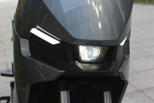 在精妙的外表下,小牛电动GOVA F0的质量也足以让人满意。整车采用碳素结构钢车架,车身坚固耐久。隐藏在前轮上方的前车灯,标配LED灯光,在亮度上要远超同价位普遍采用的卤素车灯。而在主灯两旁,GOVA F0还配有两枚日间行车灯,进一步提升了行车安全。三体大灯的线条,一改小牛往日圆形天使眼大灯的NIU标签,更具动感。