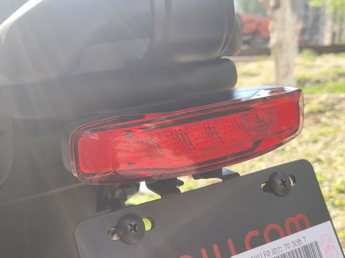 小牛电动GOVA F0的尾灯采用矩阵式设计,同样的LED光源,不同的功用。刹车灯位于中部,两旁的转向灯指向明确,显示清晰。对于2000元档的电动自行车而言,全车LED+日间行车灯的灯光组合堪称奢华。