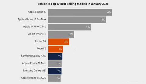 这几年随处可见大家对苹果手机的吐槽,可如果你以为这就能撼动它业界大佬的地位,那就错了!任何说法在销量面前都显得苍白无力,看看这份今年一月的全球手机销量榜单,不仅第一名被iPhone收入囊中,而且前十名市场占比最高的机型中,苹果就占了六个席位,人气之高可真是不服都不行。