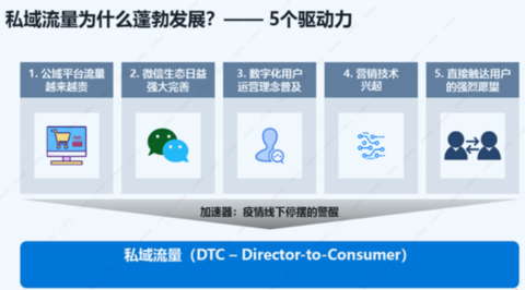 其实私域的兴起,原因有5个方面。第一是公域越来越贵,所以要把这些公域流量,包括经销商的数据,掌握到品牌方的手里,这是企业数字营销最重要的抓手;另外还有微信生态圈的完善、新兴营销手段的兴起、企业直接触达消费者的愿望逐渐强等几方面原因。