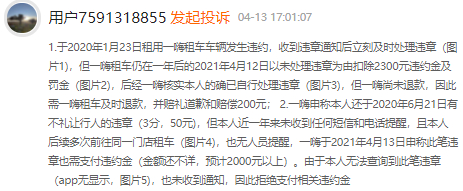 2020年1月23日,某消费者租用一嗨租车时车辆发生违约,收到违章通知后,该名消费者立刻处理了违章,但一嗨租车仍在2021年4月12日以未处理违章为由扣除消费者2300元违约金及罚金。后经一嗨租车核实,此消费者的确已自行处理违章,但一嗨租车并未退款。