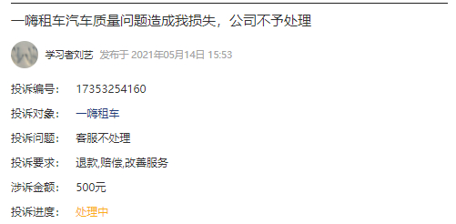 5月14日,黑猫投诉平台显示,一嗨租车因汽车质量问题被消费者投诉,要求该公司赔偿其500元,目前该投诉仍在处理中。