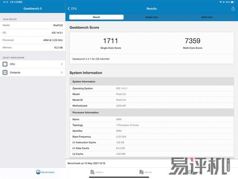 为了进一步验证iPad Pro 2021在M1芯片加持下的综合性能表现,我们就首先用GeekBench 5来进行跑分实测,单核得分为1711,多核得分为7359。相比上代搭载A12Z的iPad Pro 2020,其单核得分为1111,多核得分为4693。如此算来,单核性能提升54%,多核性能提升56%,官方表述称CPU性能提升50%绝非虚言。