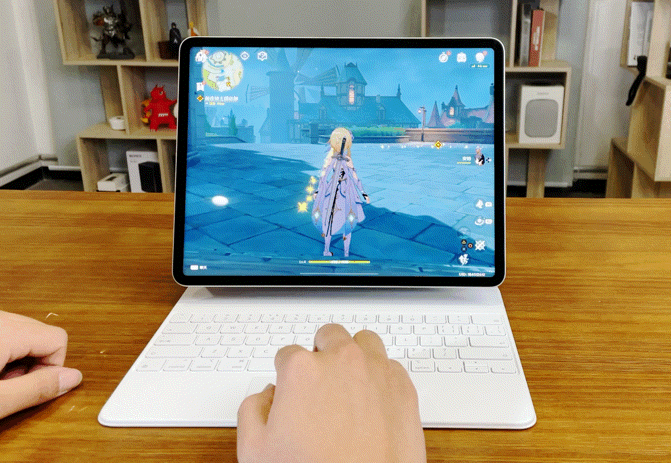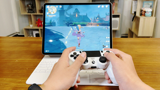此次2021版新iPad Pro,我们依然选用《原神》进行测试,画质等参数都调到最高,使用PlayStation DualShock 4无线控制器,手柄模式下进行游戏实测,让iPad变身为便携显示器,通过手柄就可以进行各种操作,整个游戏体验下来,画面没有任何卡顿延迟,操控也非常爽滑,就像是在用玩主机游戏一样。