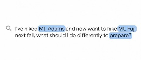 Raghavan展示了一个关于登山准备的非常复杂的问题。示例:“我已攀过亚当斯山,现计划明年秋天爬富士山,请问我还要做好其它准备嘛?”反馈的结果是:“富士山高度与之相当,但温度更冷,所以请备好相关装备(辅以可翻译的日文来源信息)”。
