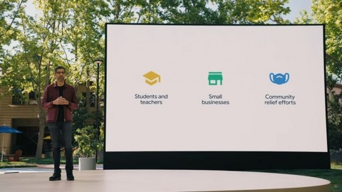 Google已经为这场主题演讲准备了两年时间,预计今天的发布会时长将达到2小时(随后还有开发者专场)。镜头切到山景城谷歌园区,CEO皮查伊登场。本次发布会严格遵循 COVID-19 防疫政策,Sundar Pichai 来到了位于室外的圆形舞台中央。现场只有少量人员参与,并且保持着安全的距离。