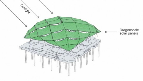 另外,谷歌还在内华达州进行一个新的地热发电项目。Pichai展示了谷歌新园区的“龙鳞太阳能皮(dragon scale solar skin)”帐篷式屋顶。