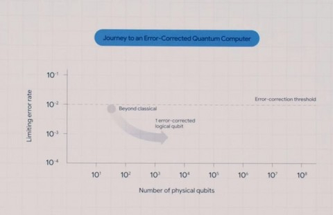 接下来进入量子计算版块。即使是来自外太空的宇宙射线也能破坏量子过程。谷歌试图减少其物理量子位的错误率,它想要打造一台可以修正错误的量子计算机。谷歌有一个致力于实现这一量子计算目标的新数据中心和量子人工智能园区。