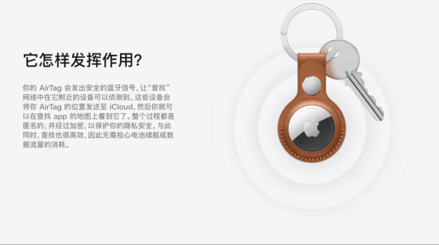 一旦你的AirTag“发现”身边有iPhone经过,就会发送蓝牙信号给这台iPhone,接着它会将AirTag的位置信息传给iCloud(这台iPhone需要联网状态),iCloud再通知你。
