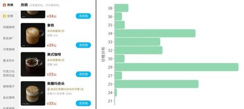 星巴克的外卖渠道有两个,一是自建的小程序里的“专星送”,没有销量信息;另一个是饿了吗,可以看到近一个月的销量,价格销量分布如下,计算加权平均值30.4元起。那么星巴克中国日均销售杯数 ≈3903.2万/30.4≈ 128.4万杯。