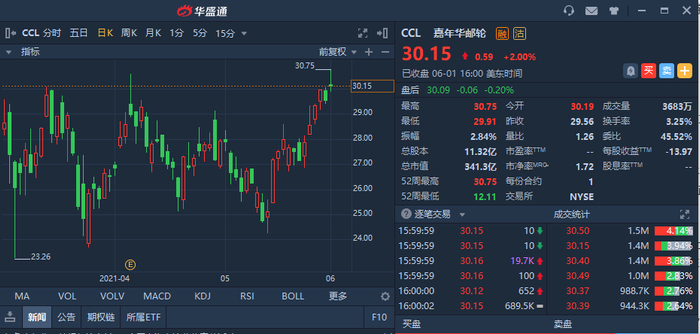 这一消息极大的刺激了市场,邮轮板块股票在昨天的交易时段纷纷走高。美股盘前,CCL收涨2%,报价30.15美元。