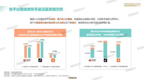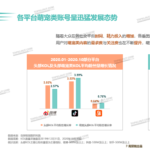 据克劳锐数据统计,2020年,微博头部萌宠账号平均粉丝增长率超2.5%、快手宠物相关类视频单日最高播放量达7亿、抖音TOP500账号中粉丝量级达100W的超50%……萌宠相关的内容市场仍在持续扩展。