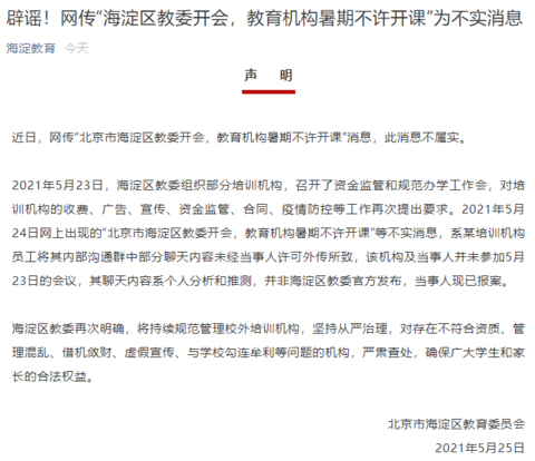5月24日,一张截图在业内流传,其中提到的教育机构暑期不让上课已被海淀区教委辟谣,但不准投广告、不准上市,6岁以前所有线上线下培训都将被禁止的说法,还无定论。