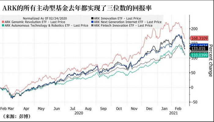 ARKK(颠覆性创新):这只股票是其他四只主动型ETF的综合,也是市值最大的一支ETF。本支基金一般包含35-55支股票。2021年三月底的市值在约210.2亿美元。