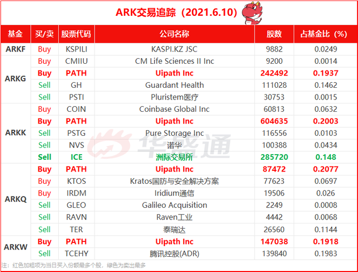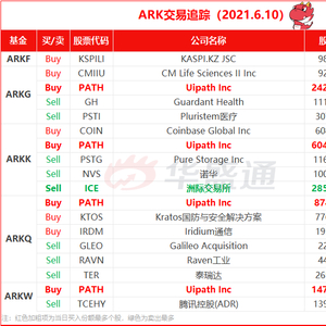 ARKK继续加仓Coinbase约6.1万股, 斥资约1341万美元。6月10日消息,401k服务提供商ForUsAll Inc.宣布与加密货币交易所Coinbase Global的机构部门达成一项协议,允许其管理的养老金计划中的员工将最多5%的退休金投资于比特币、以太币、莱特币等。继续加仓Uipath Inc约108.2万股,斥资约7565万美元。UiPath是一家开发机器人流程自动化平台的全球软件公司,在每年的RPA行业全球性分析报告中UiPath都能名列前茅,令众多同类公司望尘莫及,据悉去年UiPath获得了RPA垂直领域的最高收入。►卖出: