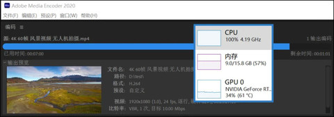 ▲使用Media Encoder将4K@60Hz的《无人机风景》转码为FHD@24fps,处理器方案,RTX3060参与加速。这个测试比较特殊,i7 11800H能始终保持极高的全核频率(4.19GHz,而该处理器的全核最高睿频为4.2GHz)完成整个转码过程,耗时仅8分3秒。而第10代酷睿i7 10875H在相同的测试条件下(120W跑满,全核最高睿频,也是RTX3060参与加速),总耗时为10分20秒——第11代酷睿H45效率提升高达22%!