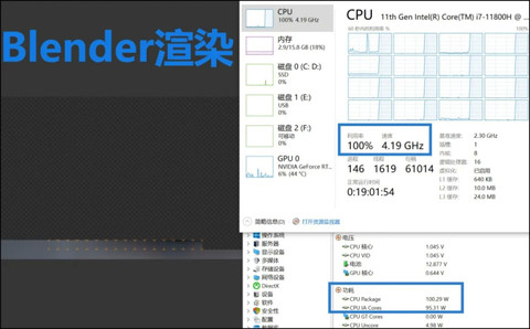 ▲而第11代酷睿i7 11800H,新款钛钽Plus在大部分应用中只能短时间跑满全核最高睿频4.2GHz,此时Package Power为100W左右;而后封装功率会适当降低,比如Blender的BMW样张渲染测试,最终以86W/3.9GHz左右完成渲染。但个别应用又可以跑满全核睿频。