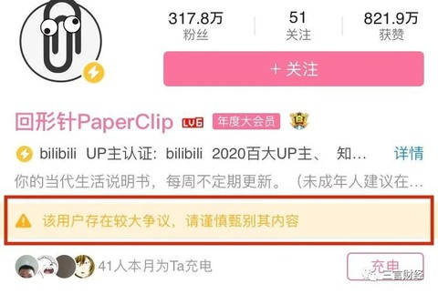 目前,回形针B站账号已被标注“该用户存在较大争议,请谨慎甄别其内容”的标签。